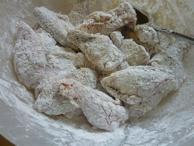 • Крылья по чистить, чеснок измельчить. Крылья положить в миску и посыпать крахмалом, хорошо перемешать что бы все крылышки были покрыты.