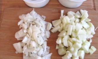 • Яблоко и лук почистить, порезать кубиками.