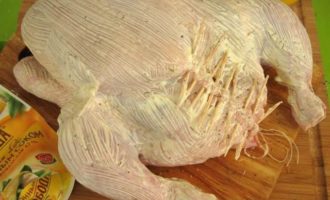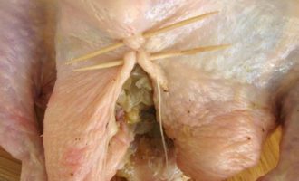 • Духовку разогреть до 190°С. Наполнить брюшко курицы начинкой.