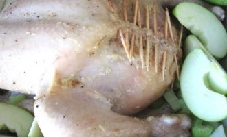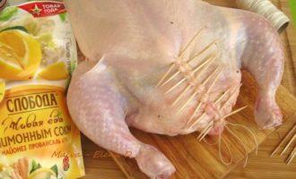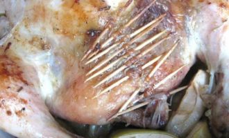 • Вынуть курицу из духовки, аккуратно снять шнуровку, потянув за узелок, по ходу действия с нитью убирать зубочистки.