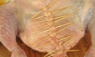 • С помощью зубочисток заколоть брюшко, под каждую зубочистку пропускать кулинарную нить крест-накрест. Начинать со средней части нити. Сначала взять одну зубочистку, пропустить нить. Первый стежок.