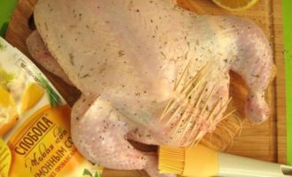 • Обмазать майонезом ТМ «Слобода» с лимонным соком. Поставить в духовку. Когда начнет выделяться сок от курицы, поливать им периодически курицу.