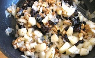 • Репчатый лук обжарить на оливковом масле, ближе к концу обжаривания добавить яблоки и сливочное масло. Прожарить немного. Посолить чуть-чуть, поперчить. Снять с огня. Добавить чернослив и орехи к смеси в сковороде, перемешать.