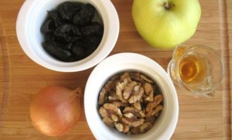 • Чернослив порезать, орехи крупно порубить.