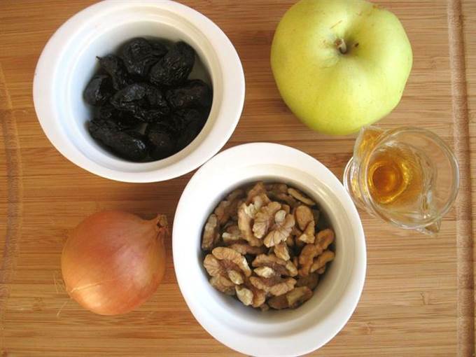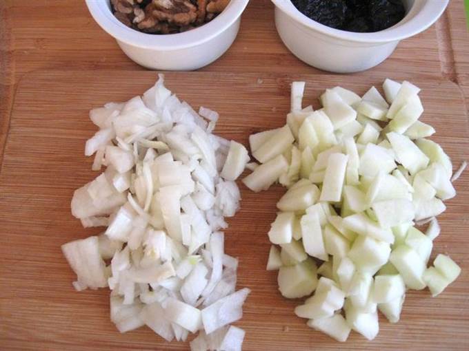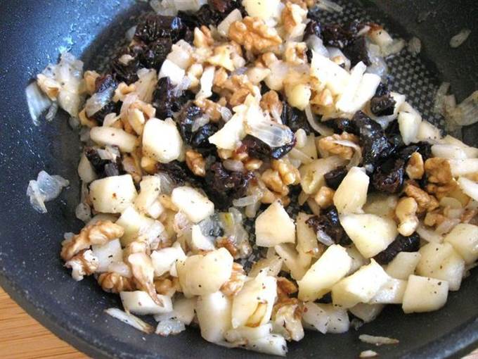 • Репчатый лук обжарить на оливковом масле, ближе к концу обжаривания добавить яблоки и сливочное масло. Прожарить немного. Посолить чуть-чуть, поперчить. Снять с огня. Добавить чернослив и орехи к смеси в сковороде, перемешать.