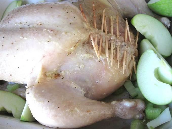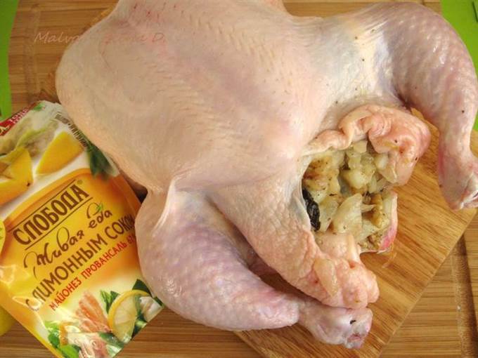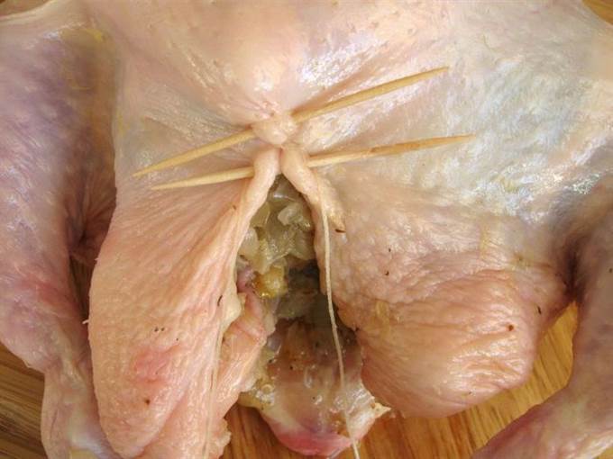 • Духовку разогреть до 190°С. Наполнить брюшко курицы начинкой.