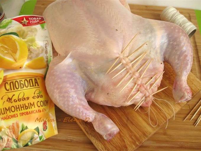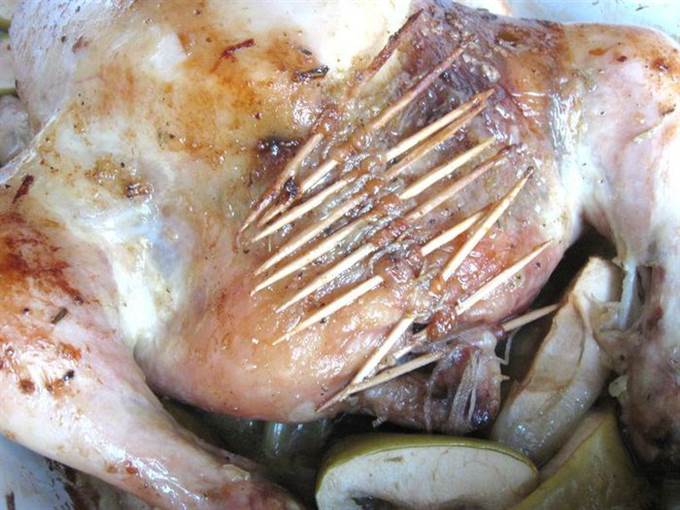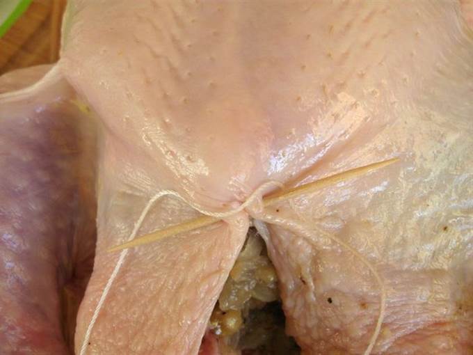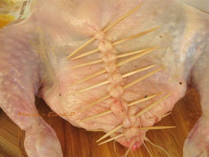 • Вынуть курицу из духовки, аккуратно снять шнуровку, потянув за узелок, по ходу действия с нитью убирать зубочистки.