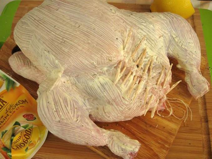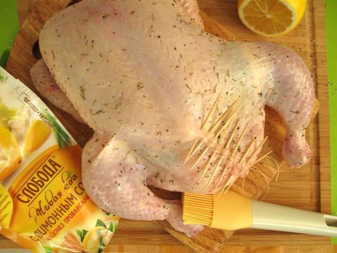 • Обмазать майонезом ТМ «Слобода» с лимонным соком. Поставить в духовку. Когда начнет выделяться сок от курицы, поливать им периодически курицу.
