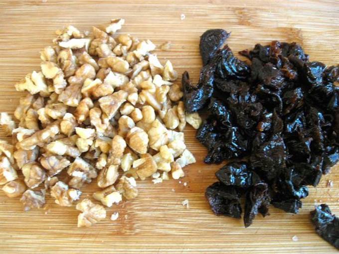 • Чернослив порезать, орехи крупно порубить.