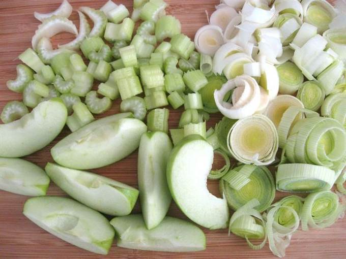 • Яблоки (гренни смит) не чистить от кожуры, нарезать на четвертинки, вырезать семенную часть, разрезать еще пополам на дольки. Лук порей нарезать колечками, сельдерей — кусочками.