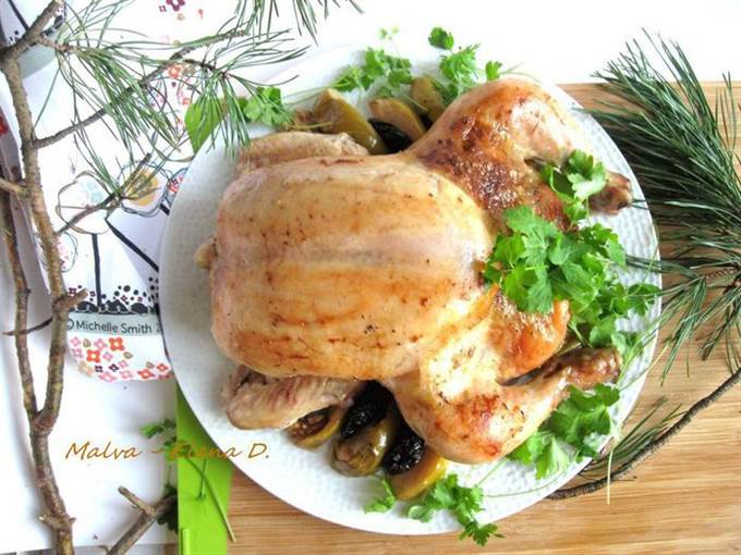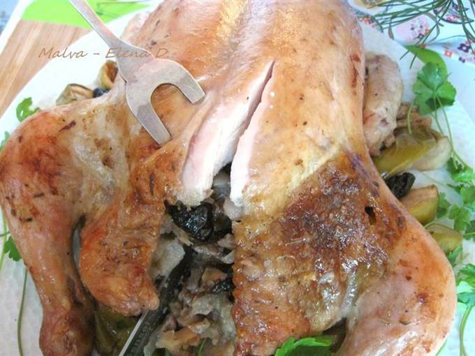 Курица, фаршированная орехами, черносливом и яблоком