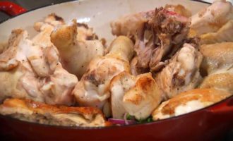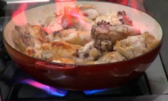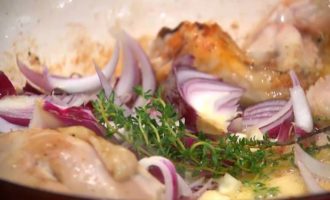 Вынуть из сковороды часть обжаренных кусков курицы, выложить лук, чеснок и оставшиеся веточки тимьяна, все перемешать, обжарить лук с чесноком до золотистого цвета, затем вернуть все куски курицы обратно в сковороду.