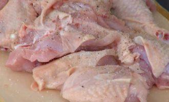 Курицу разрезать на небольшие куски, посолить, поперчить.