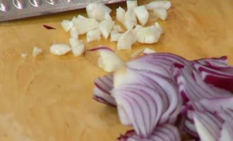 Чеснок почистить, раздавить плоской стороной ножа и слегка измельчить.