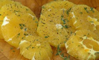 С двух апельсинов срезать кожуру, мякоть нарезать кружками, посыпать листьями с двух веточек тимьяна, посолить и поперчить.