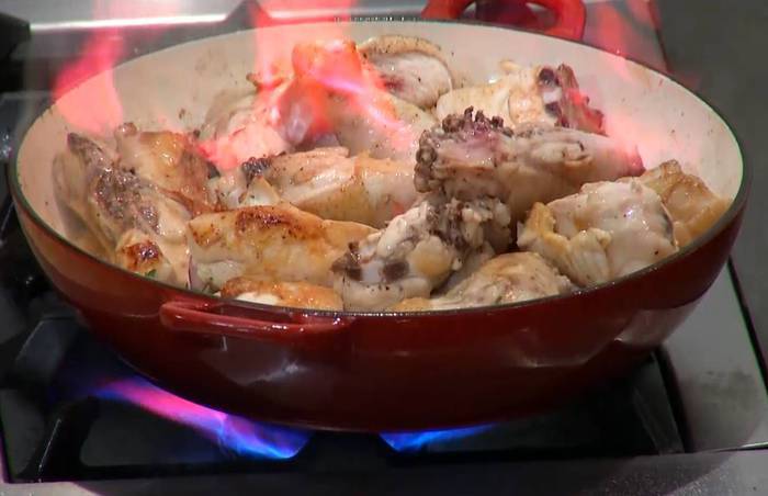 Влить в сковороду с курицей портвейн и дать алкоголю выпариться.