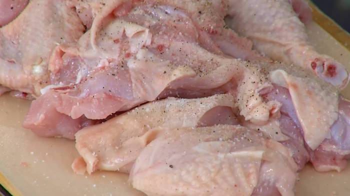 Курицу разрезать на небольшие куски, посолить, поперчить.