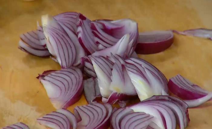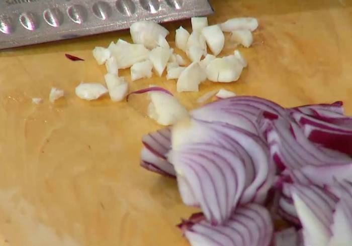 Чеснок почистить, раздавить плоской стороной ножа и слегка измельчить.