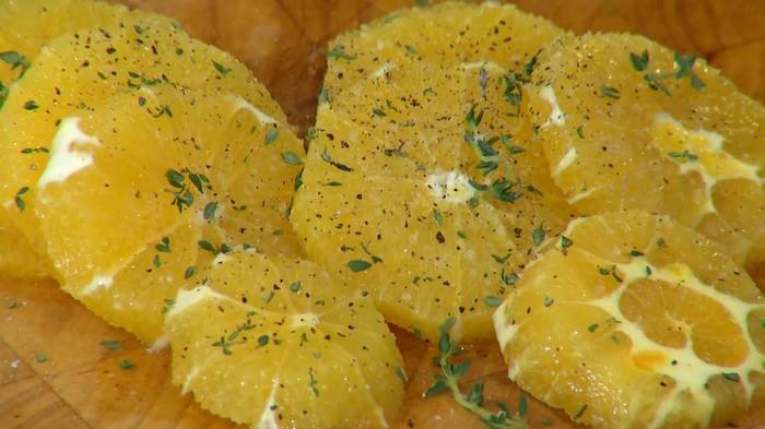 С двух апельсинов срезать кожуру, мякоть нарезать кружками, посыпать листьями с двух веточек тимьяна, посолить и поперчить.