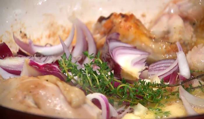 Вынуть из сковороды часть обжаренных кусков курицы, выложить лук, чеснок и оставшиеся веточки тимьяна, все перемешать, обжарить лук с чесноком до золотистого цвета, затем вернуть все куски курицы обратно в сковороду.