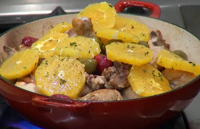 Добавить к курице оливки, сверху выложить апельсиновые кружки и тушить все до готовности под приоткрытой крышкой, чтобы выходил пар.