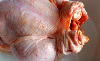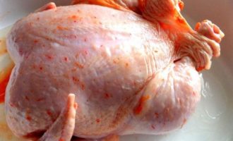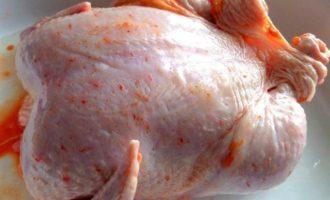 • Для моей семьи нужна большая курица, эта весит ровно 2 кг! Промываем, обсушиваем и натираем специями и приправами всю, в том числе и внутри!