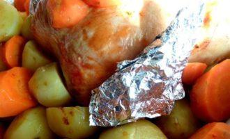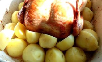 • Укладываем недоваренную картошку вокруг курицы.