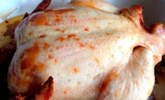 • Проверяем готовность шпажкой, протыкая в области грудок. Если выделился прозрачный, без мутности сок, то курица готова!