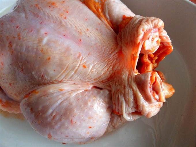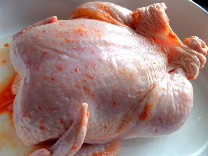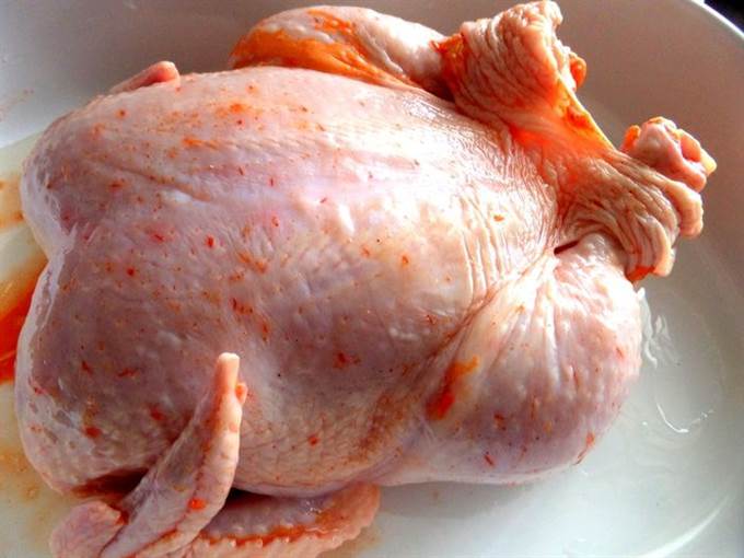 • Для моей семьи нужна большая курица, эта весит ровно 2 кг! Промываем, обсушиваем и натираем специями и приправами всю, в том числе и внутри!
