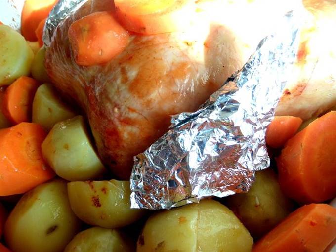• Сверху я тоже положила кружочки морковные. Все овощи поливаем собранным от курицы соком и жиром.