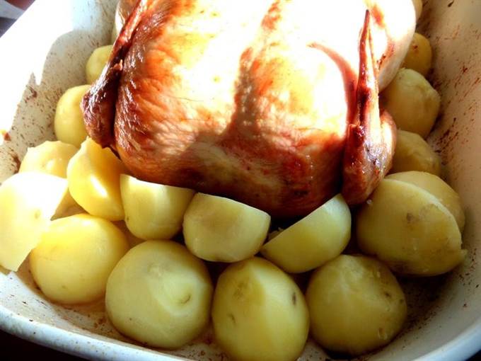 • Укладываем недоваренную картошку вокруг курицы.