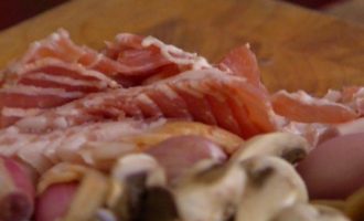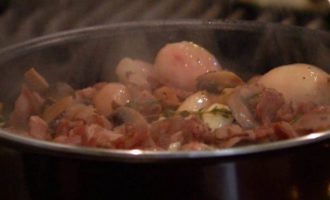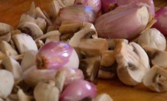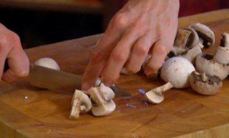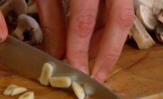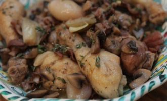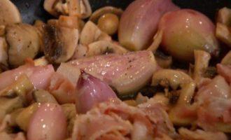 Приготовить соус: сковороду, где жарилась курица, снова поставить на огонь и обжарить на оставшемся в ней масле бекон, лук и грибы, затем все посолить и поперчить, добавить листья тимьяна, влить вино, бульон, перемешать и дать жидкости выпариться примерно на треть. Когда соус будет почти готов, добавить чеснок.