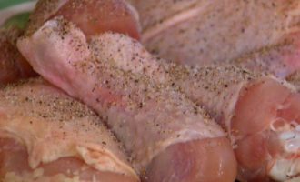Куриные бедра и голени вымыть, просушить бумажным полотенцем, посолить, поперчить.