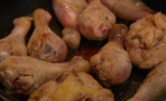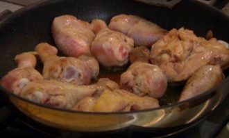 Разогреть в сковороде оливковое масло и обжарить куски курицы со всех сторон до золотистого цвета.
