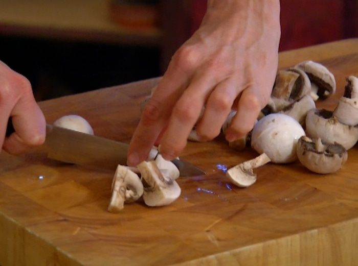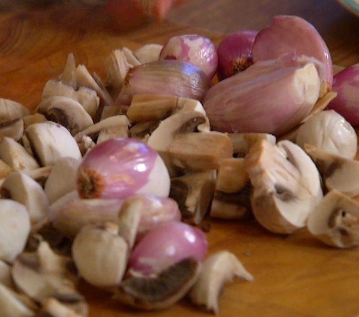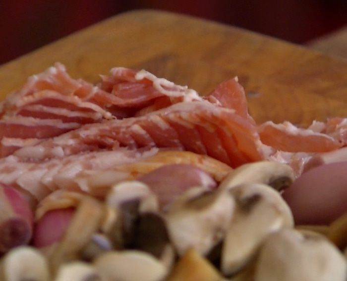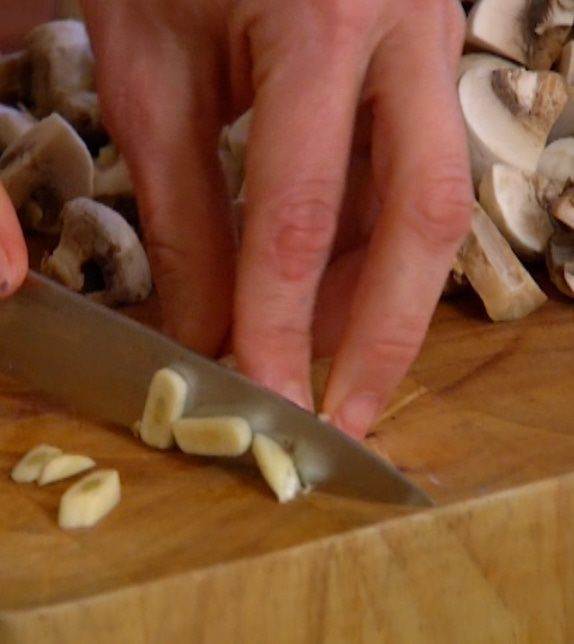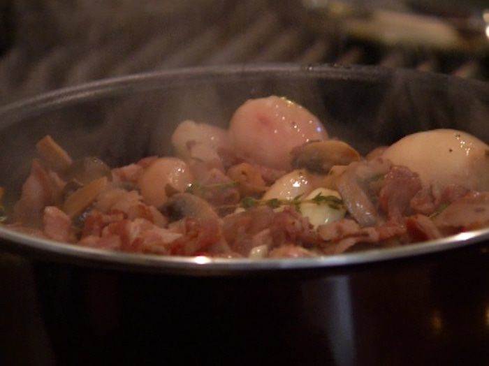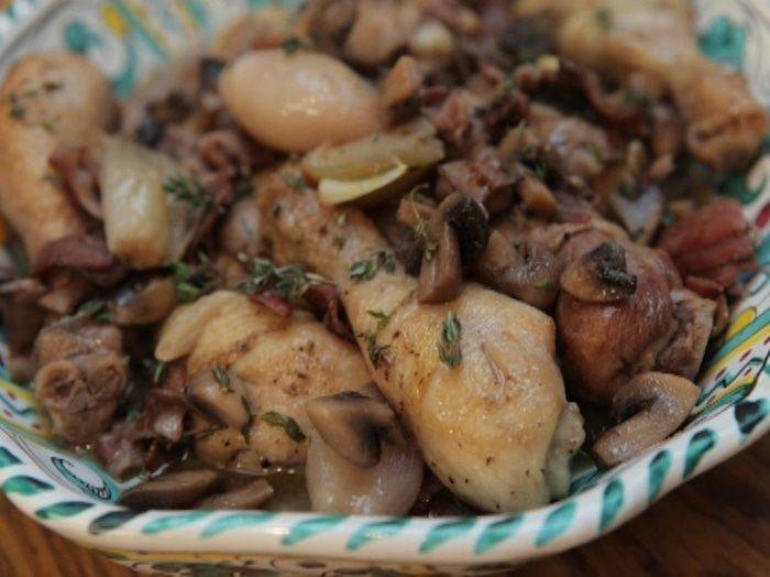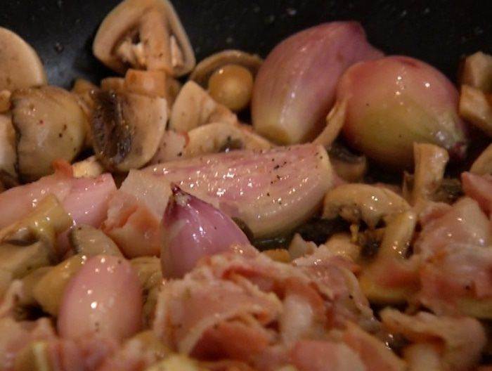 Приготовить соус: сковороду, где жарилась курица, снова поставить на огонь и обжарить на оставшемся в ней масле бекон, лук и грибы, затем все посолить и поперчить, добавить листья тимьяна, влить вино, бульон, перемешать и дать жидкости выпариться примерно на треть. Когда соус будет почти готов, добавить чеснок.