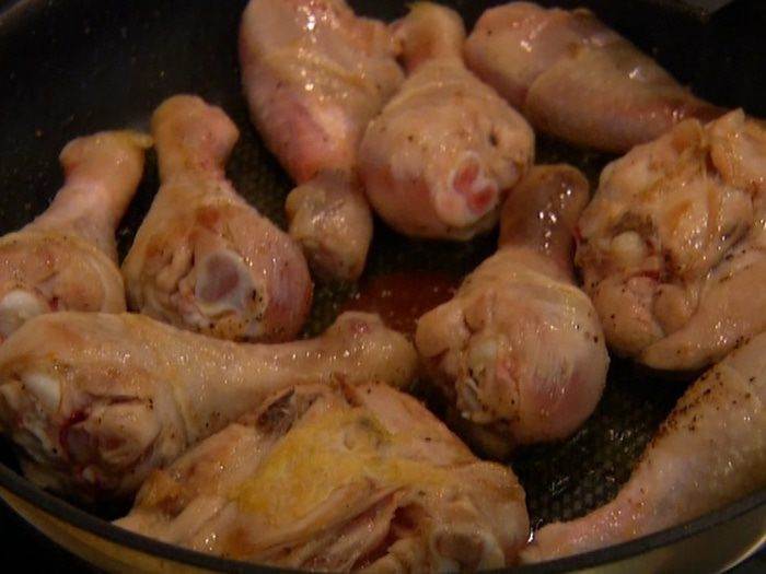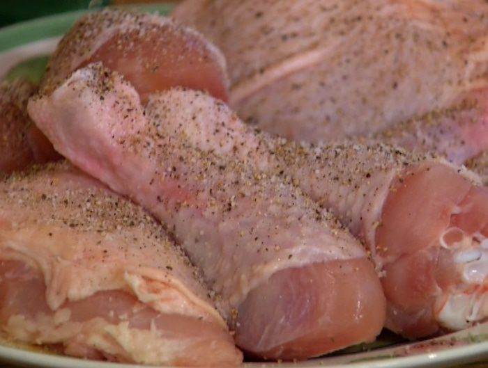 Куриные бедра и голени вымыть, просушить бумажным полотенцем, посолить, поперчить.