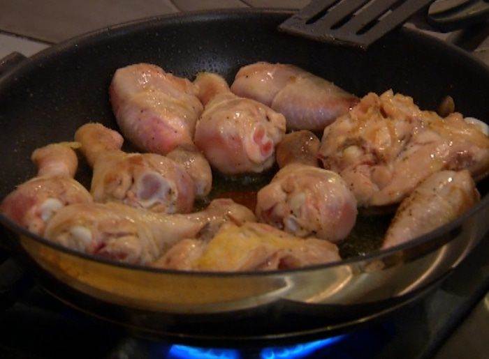 Разогреть в сковороде оливковое масло и обжарить куски курицы со всех сторон до золотистого цвета.