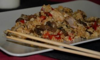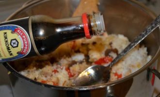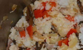 Рис промываем несколько раз, пока вода не станем белая, осторожно, не ломая руками крупу. Рис варим самый последним. Варим до 90% готовности и рассыпчатого состояния, честно говоря, в данном случае я не досмотрела и немного переварила его. Его тоже необходимо слегка обжарить (подсушить) на небольшом количестве масла 5-7 минут.