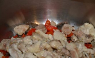 Отдельно жарим филе бедра (без кожи и костей), порезанного брусками по 2 см. Складываем к грибам и овощам.