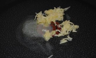 Растопить сливочное масло, трем чеснок на средней терке и пассеруем в масле 10-20 секунд, до появления аромата. Импортный чеснок в данном случае не подходит, т.к. не дает нужного запаха. Добавить к общей массе.