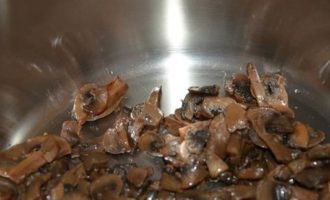 Нарезаем свежие шампиньоны кольцами или полукольцами, обжариваем их, как и каждый последующий ингредиент, на небольшом количестве рафинированного подсолнечного масла. Складываем в кастрюлю.