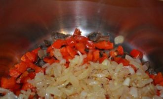 На отдельной сковороде обжариваем болгарский перец, порезанный кубиками. Перец используем сладких сортов, вместо двух красных можно взять один оранжевый. На другой сковородке обжариваем лук, порезанный кубиками. Все складываем в общую кастрюлю.