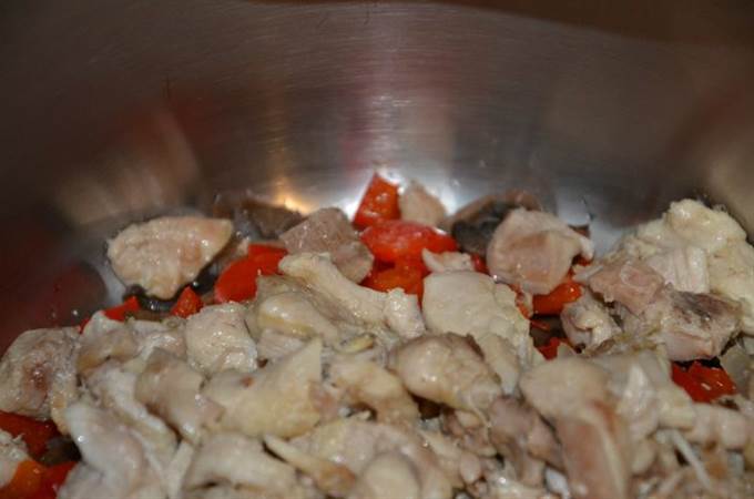 Отдельно жарим филе бедра (без кожи и костей), порезанного брусками по 2 см. Складываем к грибам и овощам.