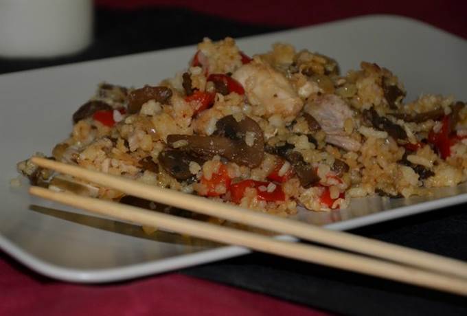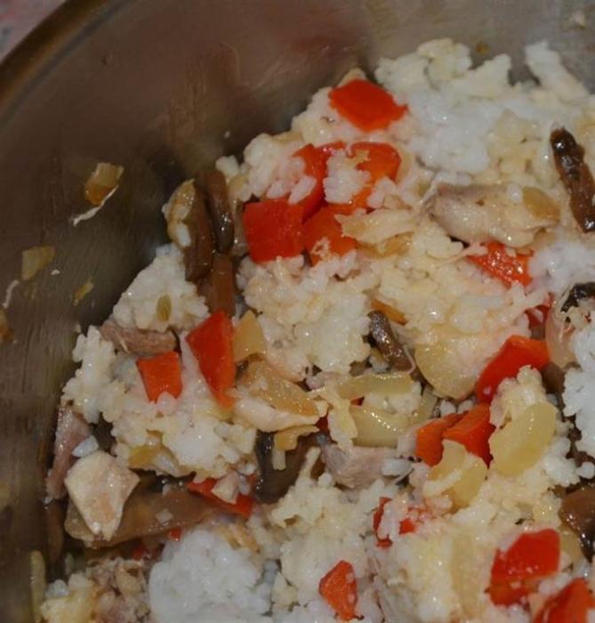 Рис промываем несколько раз, пока вода не станем белая, осторожно, не ломая руками крупу. Рис варим самый последним. Варим до 90% готовности и рассыпчатого состояния, честно говоря, в данном случае я не досмотрела и немного переварила его. Его тоже необходимо слегка обжарить (подсушить) на небольшом количестве масла 5-7 минут.