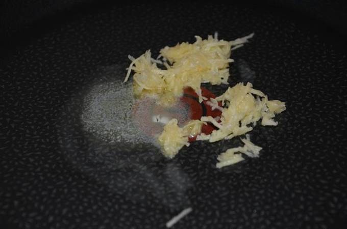 Растопить сливочное масло, трем чеснок на средней терке и пассеруем в масле 10-20 секунд, до появления аромата. Импортный чеснок в данном случае не подходит, т.к. не дает нужного запаха. Добавить к общей массе.