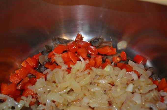 На отдельной сковороде обжариваем болгарский перец, порезанный кубиками. Перец используем сладких сортов, вместо двух красных можно взять один оранжевый. На другой сковородке обжариваем лук, порезанный кубиками. Все складываем в общую кастрюлю.