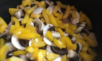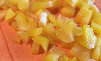 У болгарского перца удалите семена, нарежьте тонкими полосочками.