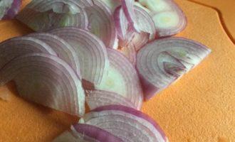 Лук почистите, нарежьте полукольцами и выложите на курочку.