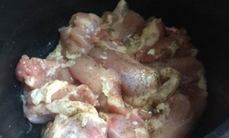 Курицу (у меня было филе без кожи и костей, но можно использовать просто тушку курицу, предварительно разделав на кусочки) выложить в чашу мультиварки, посолить, поперчить. Чеснок выдавить прессом и приправить курицу.