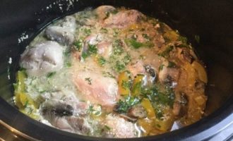За 5 минут до готовности добавьте зелень, перемешайте, закройте мультиварку и готовьте до окончания программы.